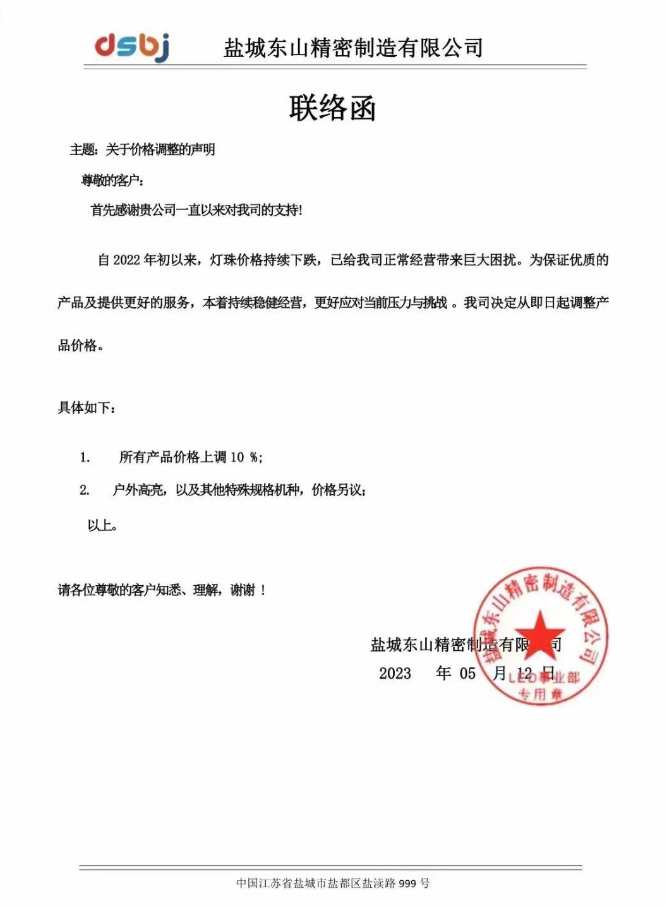 继木林森后,东山精密也于5月12日发不了关于“价格调整”的联络函。其称,自2022年初以来,灯珠价格持续下跌,已给公司正常运营带来巨大困扰。为保证优质的产品及提供更好的服务,本着持续稳健经营,更好应对当前的压力与挑战。公司决定从即日起调整产品价格:所有产品价格上调10%;户外高亮,以及其他特殊规格机种,价格另议。