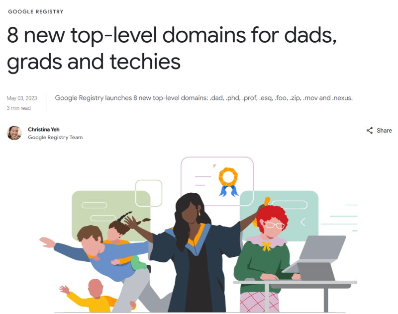 IT之家 5 月 14 日消息,谷歌日前宣布,Google Registry 推出了 8 个新的顶级域名,主要面向家长、毕业生和技术人员等。