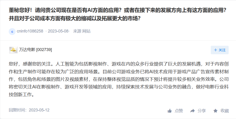 IT之家从互动平台获取到,万达电影认为,人工智能为包括影视制作、游戏在内的众多行业提供了巨大的发展机遇,对于内容创作和生产制作可能存在较为广泛的应用场景。