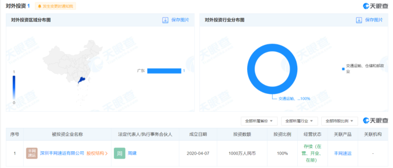 此外,标的公司丰网信息为深圳丰网速运有限公司(下称“丰网速运”)全资持股股东。天眼查资料显示,丰网信息旗下仅丰网速运一家子公司。丰网速运成立于2020年4月,注册资本1000万人民币。