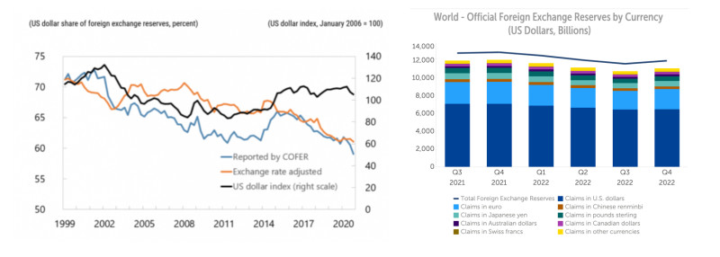 全球外汇储备中美元占比从70%+下降至40%+,2021年至2022年下降趋势仍在继续。来源:IMF