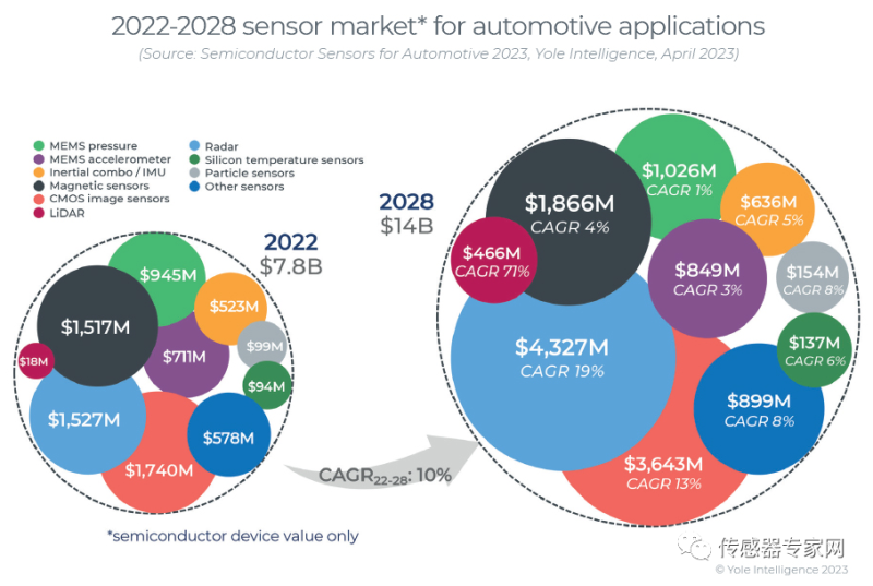Yelo预计,到2028年全球汽车半导体传感器出货量将达到为83亿个,市场规模将达到140亿美元,相比2022年增长了,年复合(2022年到2028年)增长率为10%。