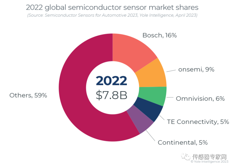 根据Yelo的统计,2022年,全球汽车市场的半导体传感器出货量为54亿个,产生了78亿美元的收入。其中博世(Bosch)占据了16%的市场份额排名第一;安森美(Onsemi)排名第二,市场份额为9%;豪威集团(Omnivision,韦尔股份)以6%的市场份额排名第三;TE份额为5%,排名第四,Continentai排名第五,市场份额为5%。