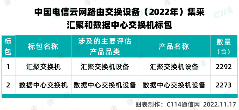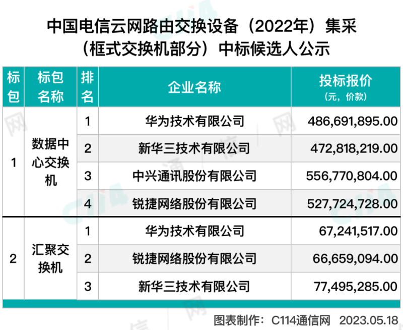 C114讯 5月18日消息(水易)来自中国电信官方消息,中国电信云网路由交换设备(2022年)集中采购项目(框式交换机部分)评标委员会按照招标文件载明的评标方法和标准已完成对各投标人递交的投标文件的评审。