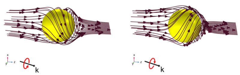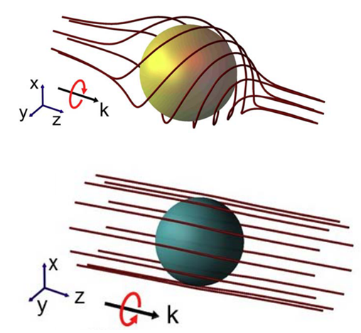 自旋角动量与轨道角动量的转化:通过偏振操纵可产生由自旋角动量调控的携带轨道角动量的光学涡旋光束。特别的,由于电磁波与金属表面自由电子集体振荡的耦合,而且金属纳米结构表面由于其介电常数梯度很大,极大地增强了光子SOI。如图所示,上图为金纳米球的轨道动量密度,下图为介质纳米球的轨道动量密度,明显看出,当圆偏光入射时在金纳米球附近产生了一个绕球旋转的涡旋。