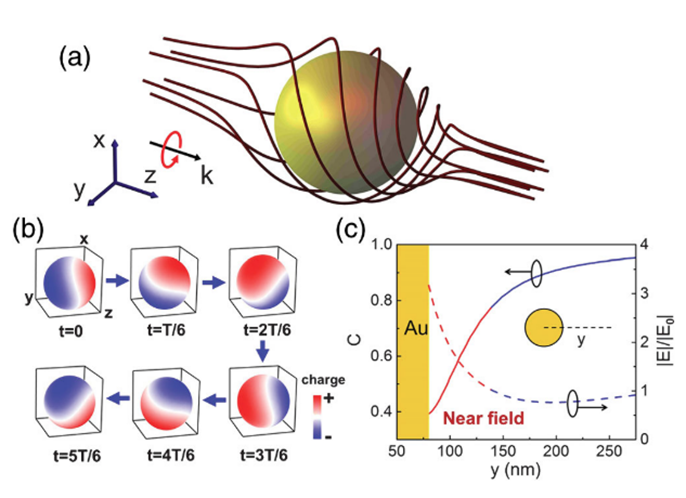 上文提到:利用圆偏光激发时,在金属小球附近会产生了一个涡旋场,为进一步验证该轨道角动量是由自旋角动量转化而来的,作者提供了电荷分布的实时演化图(b)和沿y方向的圆极化度C的分布图(c)。当一束线偏光激发金属纳米球的LSPR时,其表面极化电荷振荡方向与入射偏振方向一致,且不随时间改变。文中利用圆偏光入射时,其振荡方向旋转变化,表明产生的SP波获得了轨道角动量并绕金属纳米球循环。从图c中圆极化度C的变化来看,在近场区域圆极化度低,可见,沿z方向的自旋角动量转化为了轨道角动量,因此,在金属纳米小球附近的OAM是由SOI过程产生和介导的。