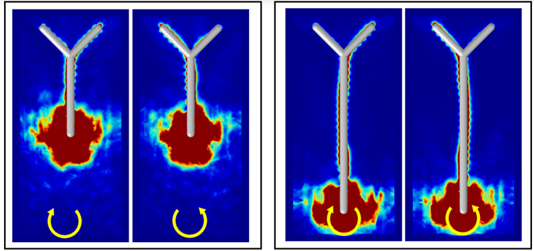 *λ *为入射光波长,n为传播模式的折射率(具体可参考文献:PRL 107, 096801,2011) 。看到这里,我对于文中长度的设计产生疑问,长度不同真的会造成发射方向不同吗?带着这个疑问,进行了仿真:粗细相同的银纳米线,左边主支路长度为2 μm,右面主支路长度为4 μm,在同种入射光下,由于支路长度不同,出光支路的确不同,这与到达分叉处的涡旋相位有关。