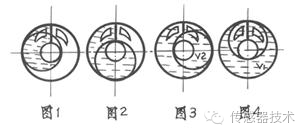 旋转活塞式流量计进出口由隔板隔开。当被测流体从进口进入计量室,这时进出口形成压差,迫使活塞逆时针旋转如图所示。流体连续流入,迫使活塞转动如图所示,形成二个半月牙腔体,在压差作用下迫使活塞转动如图3所示,V2流体从出口排出,使活塞转动如图4所示,在压差作用下转动如图l所示,V1流体从出口排出,活塞每转一周迸出的流体等于V1+V2的和。