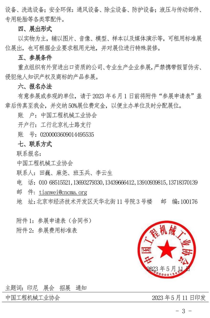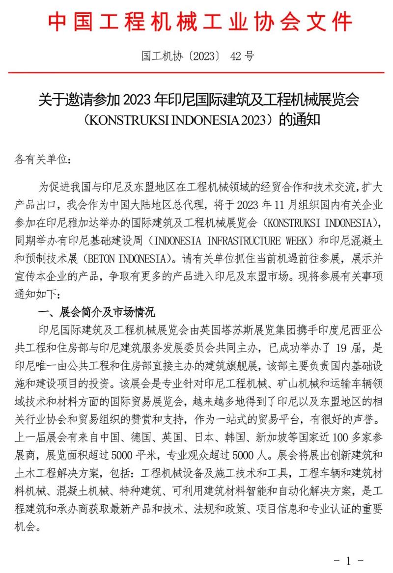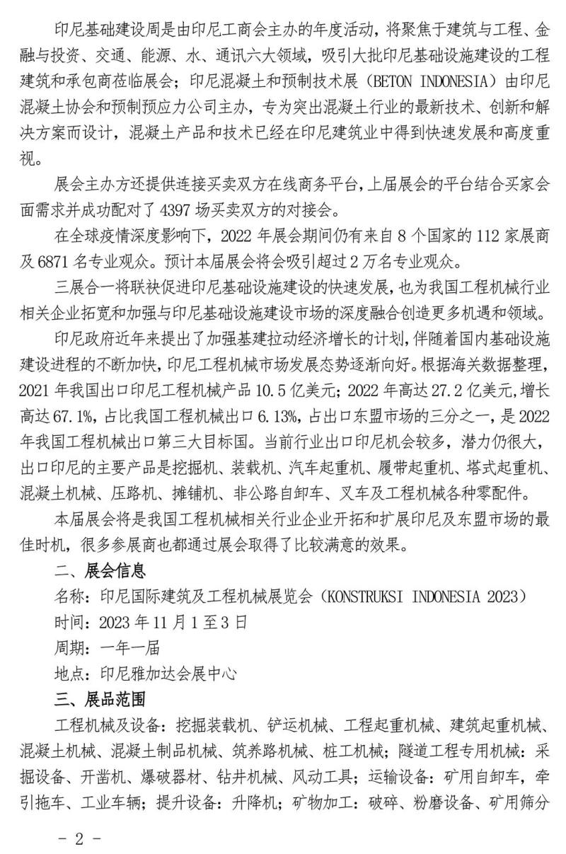 为促进我国与印尼及东盟地区在工程机械领域的经贸合作和技术交流,扩大产品出口,我会作为中国大陆地区总代理,将于2023年11月组织国内有关企业参加在印尼雅加达举办的国际建筑及工程机械展览会(KONSTRUKSI INDONESIA),同期举办有印尼基础建设周(INDONESIA INFRASTRUCTURE WEEK)和印尼混凝土和预制技术展(BETON INDONESIA)。请有关单位抓住当前机遇前往参展,展示并宣传本企业的产品,争取有更多的产品进入印尼及东盟市场。现将参展有关事项通知如下: