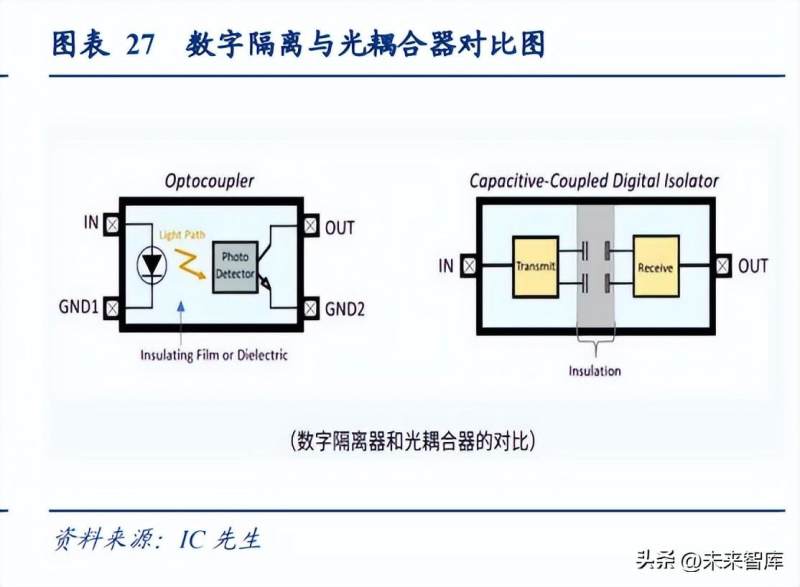 接口:接口产品主要用于电子系统之间的数字信号传输,主要包括隔离器、收发器、数 据缓冲器等。隔离器主要用于提升系统安全性,将输入、输出和工作电源三者相互隔离, 可以分为光耦合器和数字隔离器,其中数字隔离器应用最为广泛;收发器是可以支持信号发送和接收的一种产品;数据缓冲器可当数据在具有不同传输能力的元件之间通过时, 用来暂存这些数据。