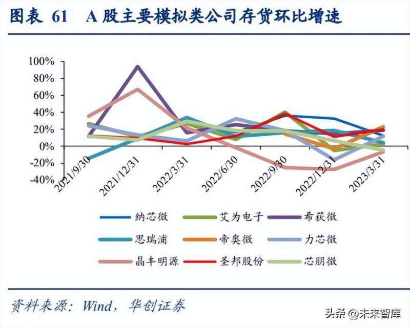 部分公司存货已出现下降,行业库存去化进程加速。2022 年,受到下游消费电子等终端 需求低迷的影响,模拟类芯片设计公司库存受到较大压力,多数公司库存出现连续多个 季度的上涨。而从存货环比增速的角度来看,大部分企业 23Q1 存货增速有所下滑,晶 丰明源、芯朋微的存货余额已出现下降。考虑到 IC 设计公司晶圆订单存在时滞,部分企 业一季度入库存货主要为去年三季度订单,前期较高订单与当期需求疲软叠加下大部分 企业库存上升存在一定合理性,基于这样的判断我们认为部分公司当前库存环比增速出 现下降表明行业已步入主动去库存阶段。