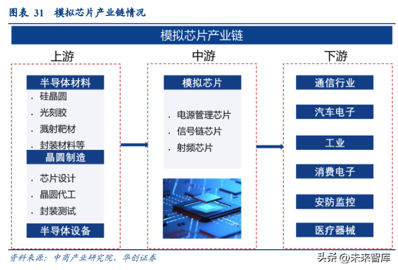 模拟芯片下游应用种类丰富。模拟芯片上游包括半导体材料、晶圆制造和半导体设备; 模拟芯片按功能划分可分为电源管理芯片、信号链芯片和射频芯片;模拟芯片下游应用 领域十分广泛,包含通信行业、汽车电子、工业、消费电子、安防监控、医疗器械等。