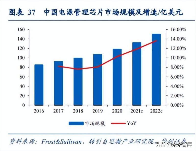 受益于下游市场发展,中国电源管理芯片市场快速增长。随着 5G 通信、新能源汽车、 物联网等下游市场的发展,对于电能应用效能的管理需求将持续增长,从而带动电源管 理芯片市场的持续增长。2021 年中国电源管理芯片市场规模约为 132 亿美元,随着国产 电源管理芯片在家用电器、3C 新兴产品等领域的应用拓展,国产电源管理芯片市场规模 有望实现快速增长。虽然国内电源管理芯片厂商起步较晚,但近年来国产替代趋势增强, 部分本土电源管理芯片设计企业的整体技术水平与国外设计公司的差距不断缩小。目前, 国内电源管理芯片产业公司相对于国外竞争对手的总体规模仍较小,具备较大的发展空 间,且受益于下游市场的发展,中国电源管理芯片市场快速增长,中国电源管理芯片规 模有望持续增长。