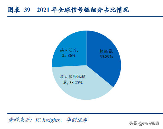 信号链芯片总体发展态势向好,市场规模稳步增长。信号链芯片作为模拟芯片的重要组 成部分,约占模拟芯片市场规模的 46%。信号链模拟芯片又可以进一步分为以放大器和 比较器为代表的线性产品,以 ADC 和 DAC 为代表的信号转换器产品以及各类接口产品, 2021 年,放大器和比较器、转换器以及接口芯片分别占信号链市场的 36.17%、39.36%、 24.47%。受益于较长的产品生命周期以及较为分散的应用场景,信号链芯片总体发展态 势向好,市场规模稳步增长。