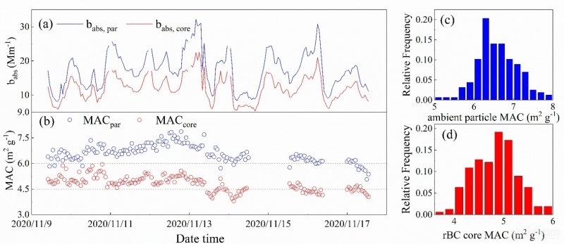 (a) 大气中含黑碳颗粒物和黑碳核的光吸收系数时间序列;(b) 大气中含黑碳颗粒物和黑碳核的吸光截面积(MAC)时间序列;(c) 大气中含黑碳颗粒物吸光截面积(MAC)相对频率分布;(d) 黑碳核吸光截面积(MAC)相对频率分布。图片均由论文作者提供