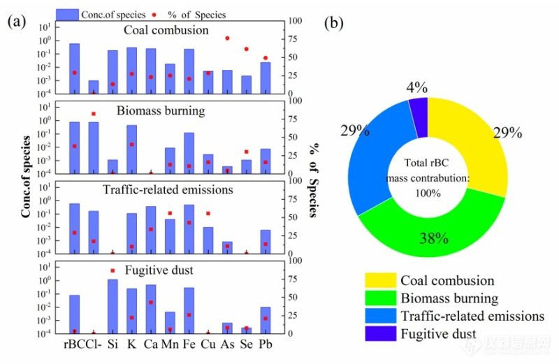 (a) 应用PMF进行黑碳质量浓度源解析谱图;(b) 各排放源对总黑碳质量浓度的相对贡献百分比。
