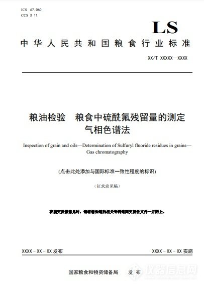 由国家粮食和物资储备局组织起草的《粮油检验 粮食中硫酰氟残留量的测定 气相色谱法》标准已形成征求意见稿,现向社会公开征求意见,截止日期为2023年7月19日。意见反馈邮箱:tc270sc1@ags.ac.cn。