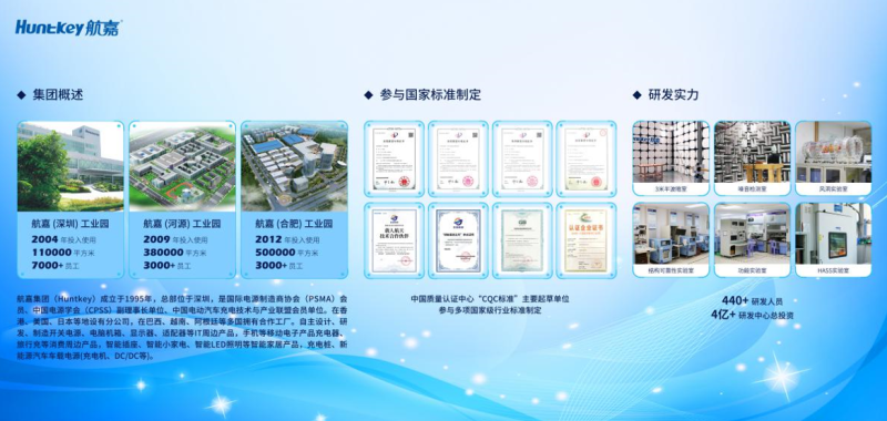 航嘉集团(Huntkey)成立于1995年,总部位于深圳,是国际电源制造商协会(PSMA)会员、中国电源学会(CPSS)副理事长单位、中国电动汽车充电技术与产业联盟会员单位。
