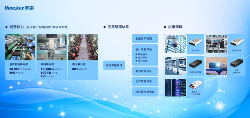 在河源,航嘉消费制造事业部拥有面积超2万平的制造场地,年产值超过30亿;精组事业部有1.8万平的制造场地,年产值达60亿!并且冲压事业部80%已实现自动化。在严格的质量管理体系下,航嘉IPC电源、工业电源、适配器在业内获得量了良好的口碑且广泛应用于安防、自动化、商用设备、一体机投影、服务器、工控机等多个领域。