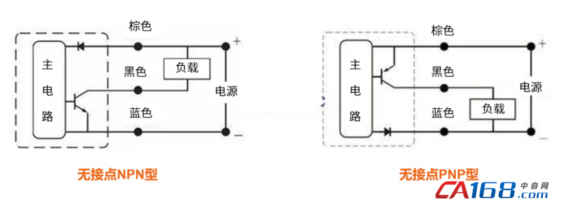 无接点电晶体型-NPN、PNP型只能用于直流电源,多为三线式;NPN、PNP在继电器回路使用时应注意接线的差异;配合PLC选型时应注意正确地选型。