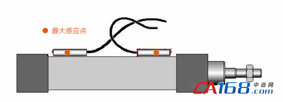 无接点式感应开关从结构和原理上与有接点式感应开关都有本质的区别,它是通过对内部晶体管的控制,来发出控制信号。当磁环靠近感应开关时,晶体管导通,产生电信号;当磁环离开磁性开关后,晶体管关断,电信号消失。最大感应点如下图: