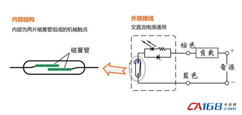 常用的磁性开关有单触点和双触点两种,单触点就是只有两条线,有磁铁靠近就会接通,双触点是三条线,其中两条接通,当有磁铁靠近的时候就会有接通另一条,既一个常开,一个常闭。