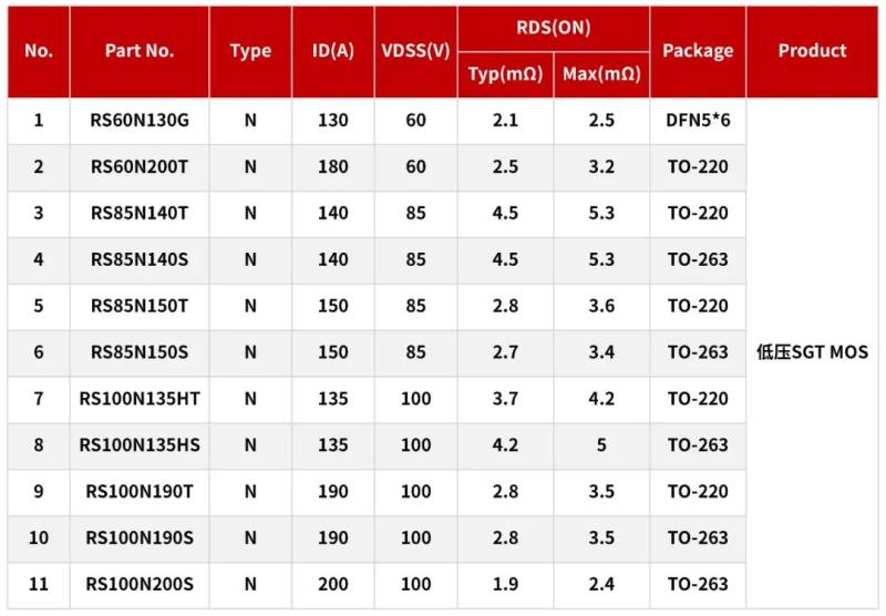 3、48V电池会选用100V耐压的MOS:RS100N135HT、RS100N135HS、 RS100N190T、RS100N190S、RS100N200S。
