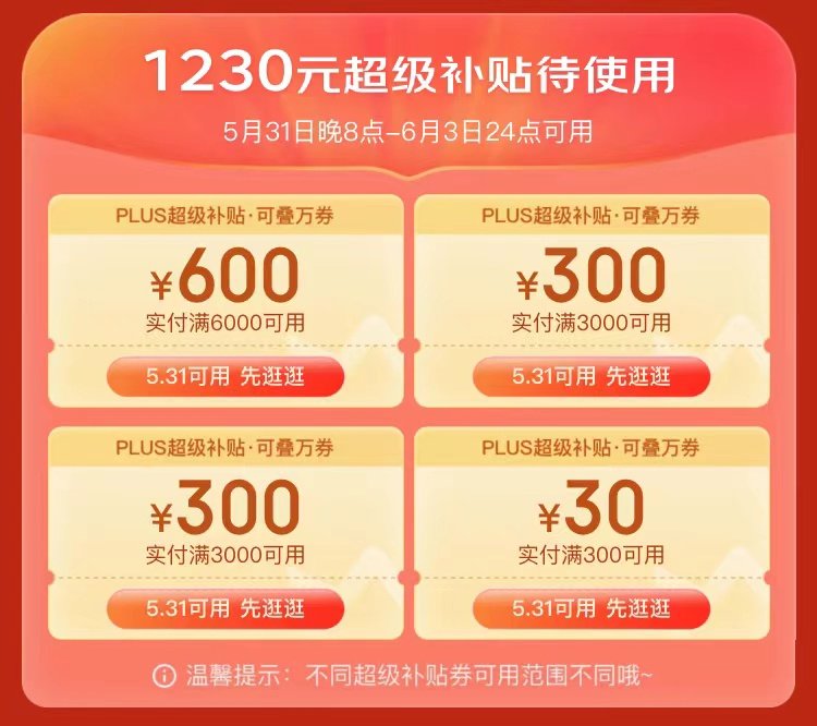 京东 PLUS 会员 618 超级补贴现已开放领取,会场内可领 6000-600 元 * 1 张、3000-300 元 * 2 张、300-30 元 * 1 张,4 张超级补贴券(共计 1230 元),可叠加万券使用:点此进入领券会场。
