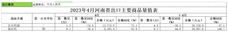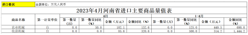 近日,郑州海关公布2023年4月河南省进出口主要商品量值表。其中农业机械方面进出口情况如下: