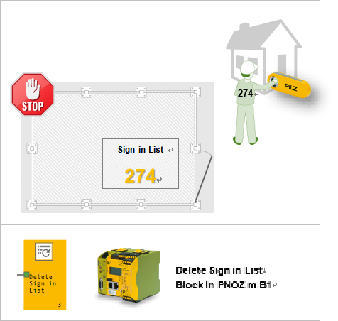 操作人员(或多个)通过安全门进入安全防护区域内部前,需要使用“个人钥匙”对安全门边上的PITreader装置进行授权识别,被允许的人员才能打开防护锁定装置进入内部,而人员的信息此刻就被“签入”到控制系统(PNOZmulti2或者PSS4000)。机械设备现在处于停机状态,人员的安全得到了保障。而这份保障正是来源于操作人员身上的“个人钥匙”信息已被记录。要让机械设备从新投入到运行状态,必须所有操作人员都使用了各自的“个人钥匙”实行了“签出”操作,保证每个操作人员都离开了危险区域为前提。