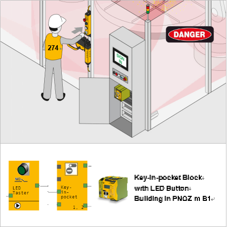 “口袋钥匙”保护功能使用Pilz控制器“PSSu PLC”(PSS 4000)和“PNOZ m B1”(PNOZmulti 2)中的功能块/模块实现。