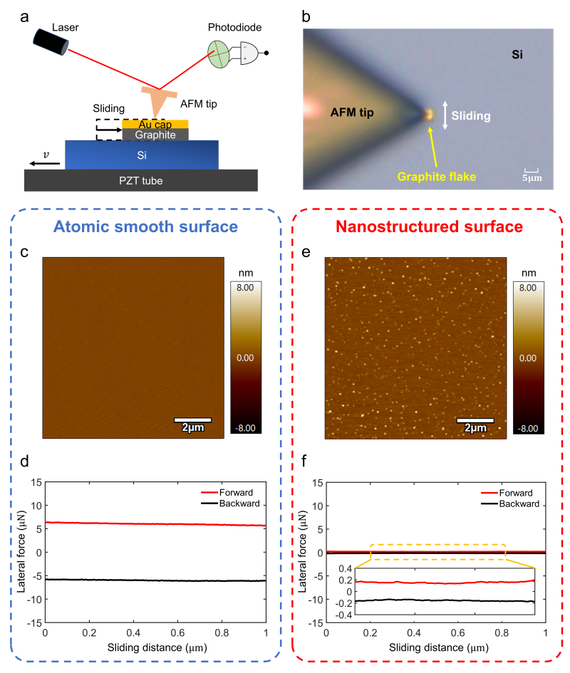 超滑石墨片和两种硅表面的摩擦力测量。(a)测量石墨/硅界面摩擦力的实验装置示意图。将硅牢固地固定在压电陶瓷换能器 (PZT)平台上,其上放置了带有Au盖的石墨片。法向力和侧向力是通过将原子力显微镜(AFM)探针尖端压在Au盖顶部来施加的。当PZT载物台以速度v往复运动时,AFM探针尖端将拖拽石墨片在硅上往复滑动。(b)实验装置的光学显微图像。(c)和(e)分别是原子级光滑硅表面和纳米结构硅表面的表面形貌。(d)和(f)分别为石墨片在原子级光滑硅表面和纳米结构硅表面滑动时的侧向力信号,滑动位移幅度为1μm,速度为2 μm/s,法向力为20.04μN。