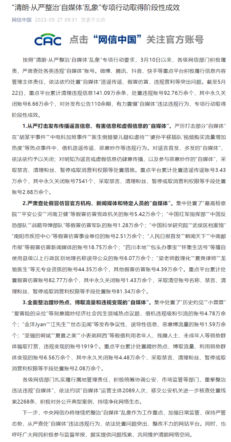 IT之家 5 月 27 日消息,网信办自 3 月 12 日开启为期两个月的“清朗・从严整治‘自媒体’乱象”专项行动,今天公布了阶段性成果。截至 5 月 22 日,重点平台累计清理违规信息 141.09 万余条,处置违规账号 92.76 万余个,其中永久关闭账号 6.66 万余个,对外发布公告 110 余期,各级网信部门依法约谈“自媒体”运营主体 2089 人次。