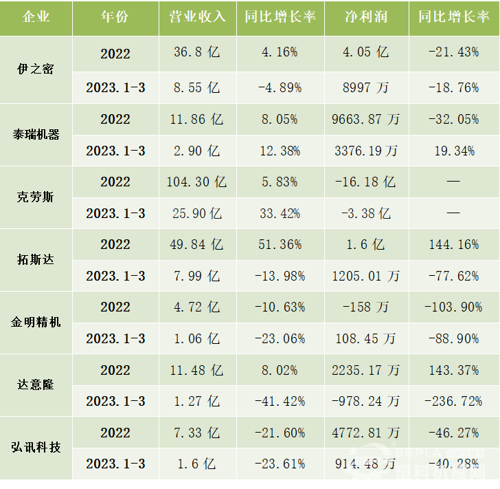 【塑料机械网 热点关注】日前,本网已将一批塑机上市企业2022年财报做了汇总整理。(回顾:八家上市塑机企业2022年业绩汇总)今年开局,我国塑机市场发展又将如何?据统计,目前伊之密、泰瑞机器、克劳斯等多家塑料机械上市企业2023年一季报已经披露。其中,除泰瑞机器实现营收净利双增外,多家企业今年一季度业绩均呈下降态势。