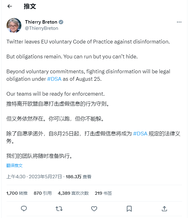 欧盟内部市场专员蒂埃里・布雷顿(Thierry Breton)发布推文,IT之家翻译如下: