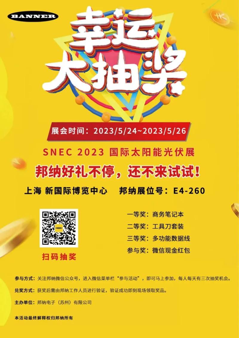 随着全球对清洁能源的需求不断增加,光伏市场将会继续扩大。越来越多的国家和地区将采用光伏发电,这将促进光伏产业的发展。当前,光伏技术在不断地发展,光伏电池的效率不断提高,成本也不断降低,极大的促进了光伏发电的普及应用。在这场聚焦光伏需求的盛会中,邦纳携多款产品及方案亮相展会,助力光伏行业高质量发展。