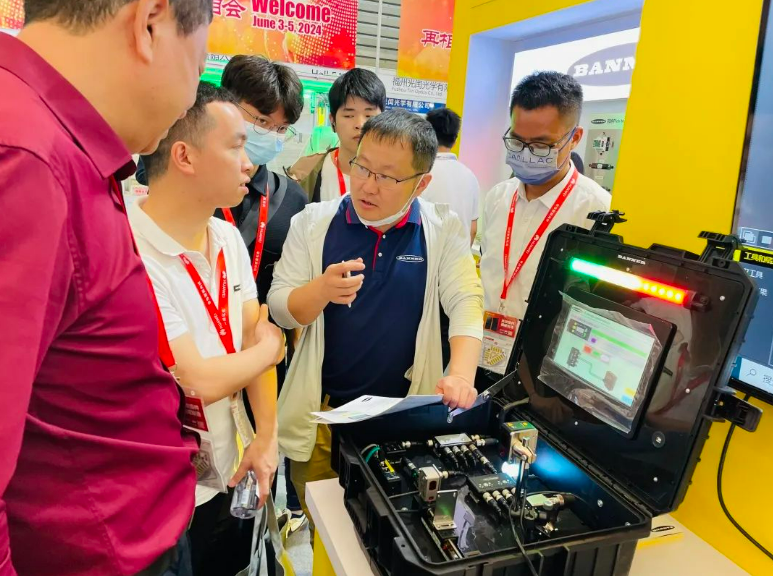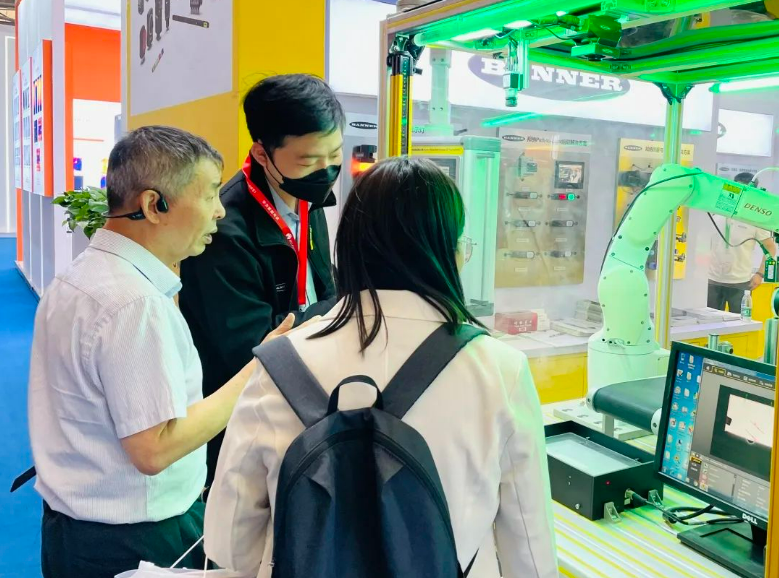 邦纳行业部同事与前来参观的观众交流并为其介绍邦纳产品。