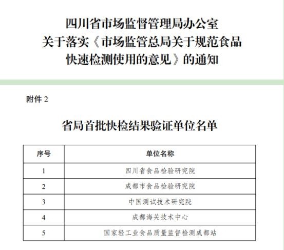 其他入选的四家单位还有四川省食品检验研究院、成都市食品检验研究院、成都海关技术中心、国家轻工业食品质量监督检测成都站等。