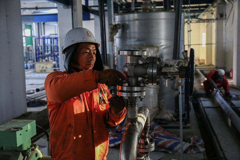 2022年12月12日,新疆库车绿氢示范项目施工现场,一名工人正在化学水站内安装管道阀阻