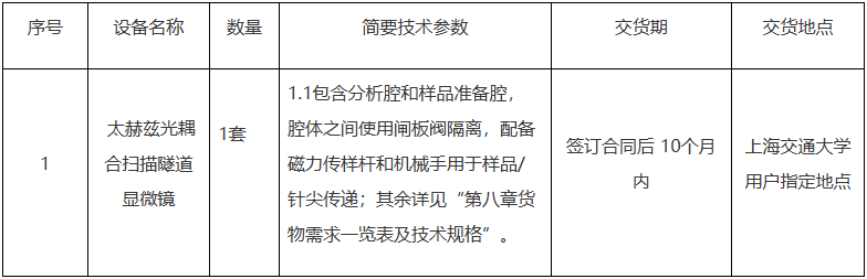 近日,上海交通大学就“上海交通大学太赫兹光耦合扫描隧道显微镜(项目编号:0773-2341SHHW0045)”项目发布公开招标公告,预算525万,购置太赫兹光耦合扫描隧道显微镜1套,项目情况如下。