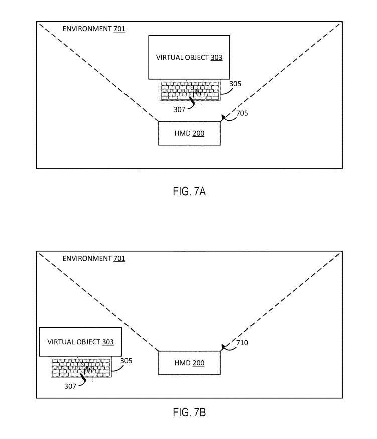 专利同时显示,虚拟输入设备可以稳定保持在一个位置坐标中,因此即使用户背过头处理其他事项后回头时,虚拟键盘还会在原来的位置等待用户操作,这种分层定位关系包括距离、方向和角度等锚点参数。