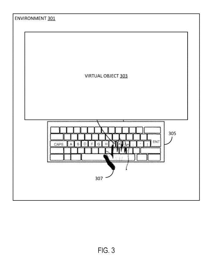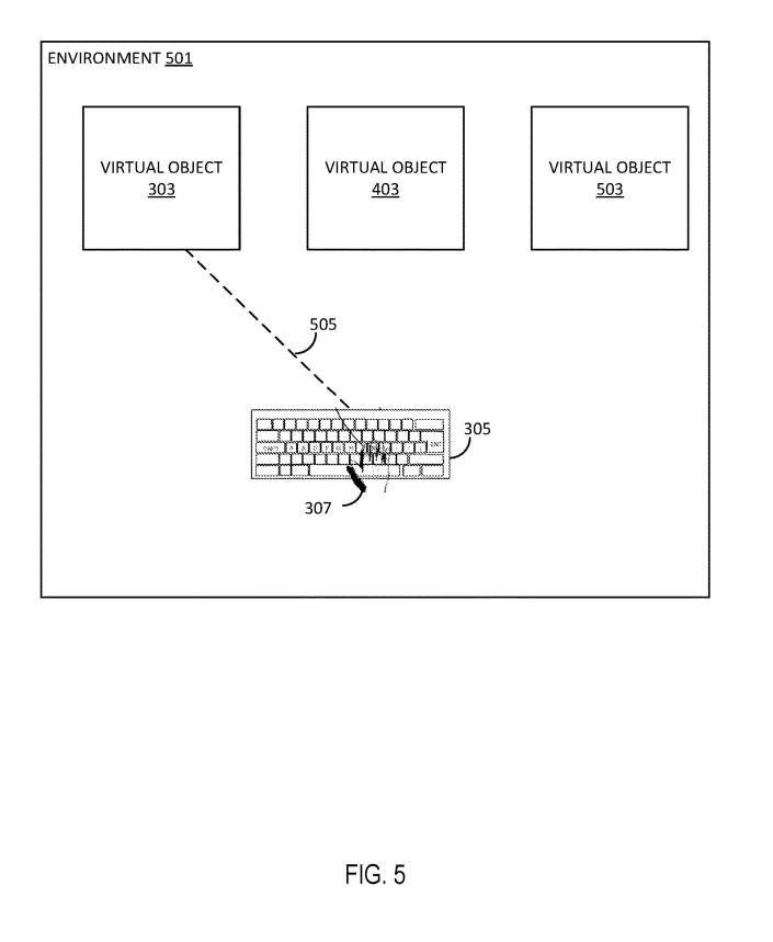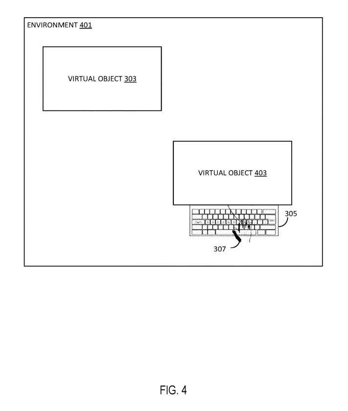 微软的这项专利申请详细描述了智能键盘附接的方法。如图所示,305 代表虚拟键盘,并且可以与虚拟对象 403 所对应的虚拟屏幕进行交互。当虚拟输入设备附接到虚拟对象时,用户无法通过其他交互机制进行输入,例如注视点交互和手指光束指点等输入方式都将被禁用。