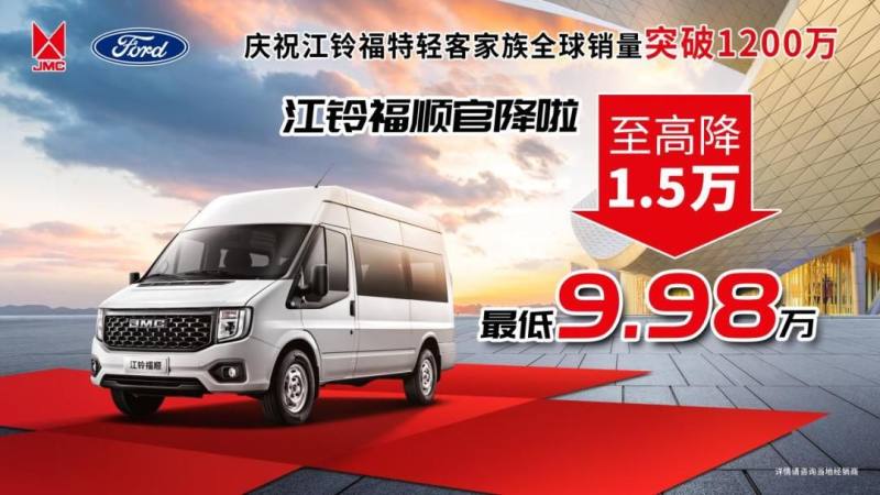 在江铃福特轻客全球销量突破1200万辆这一历史性事件来临之际,为了回馈1200万用户的支持与信任,江铃福顺官方直降至高1.5万元,让用户能够以更高性价比购买到心仪的产品。如今购买江铃福顺产品的用户可以享受三大福利,8万2年0息:即购买指定款式的江铃福顺产品,并选择分期付款方式时,在首付8万元后可享受2年0息金融服务;动力总成终身质保:即购买任意款式的江铃福顺产品后可享受动力总成终身质保服务;价格 9.98万起:即购买指定款式的江铃福顺产品时可享受 9.98万元起的超低价格。