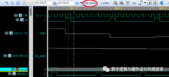 波形局部放大后如下图所示,此时输入数据有效信号 en 与输出数据有效信号 valid 是周期(50MHz)相同的脉冲信号,不是持续有效的。但工作时钟为 400MHz,所以输出也会呈现为 50MHz 采样频率下的 250KHz 频率的正弦波信号。