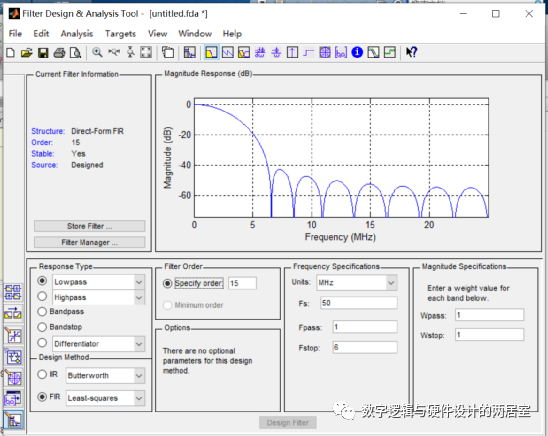 打开 matlab,在命令窗口输入命令: fdatool。