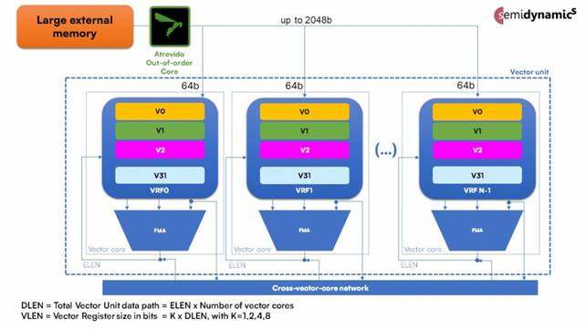 一个矢量单元由几个 "矢量核心 "组成,大致相当于一个GPU核心,可以并行地进行多种计算。每个矢量核都有算术单元,能够进行加法、减法、融合乘加、除法、平方根和逻辑运算。Semidynamics的矢量核心可以被定制以支持不同的数据类型: FP64、FP32、FP16、BF16、INT64、INT32、INT16或INT8,取决于客户的目标应用领域。以比特为单位的最大数据类型大小定义了矢量核心宽度或ELEN。然后,客户选择在矢量单元内实现的矢量核的数量,可以是4、8、16或32个核,满足非常广泛的功率-性能-面积权衡选择。一旦做出这些选择,总的矢量单元数据路径宽度或DLEN是ELEN x 矢量核的数量。Semidynamics支持DLEN配置从128b到2048b。