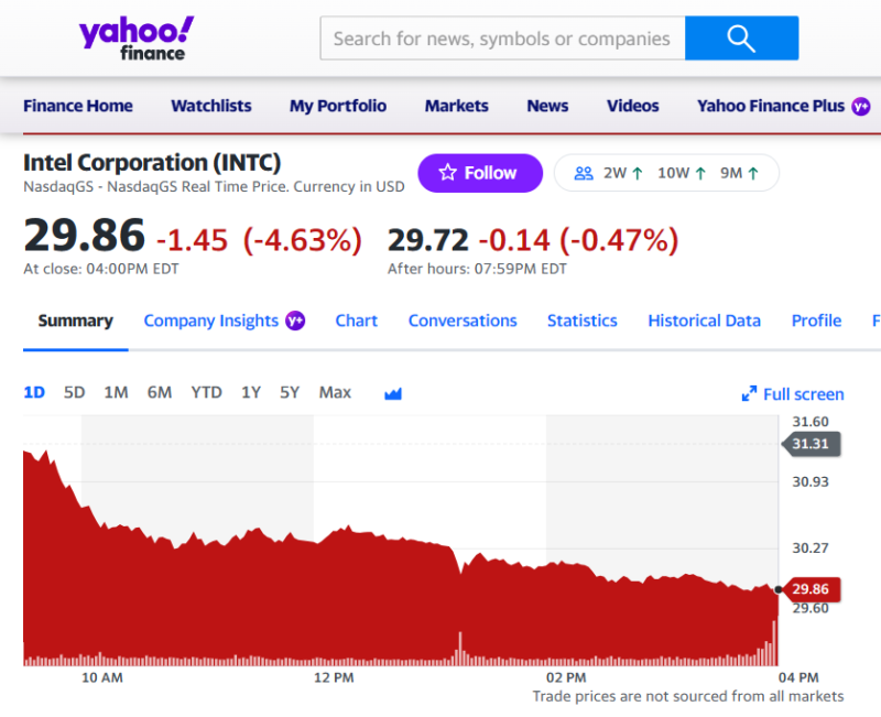 截至美股6月5日收盘,英特尔股价当日下跌了4.63%,代表了投资者对其不看好。
