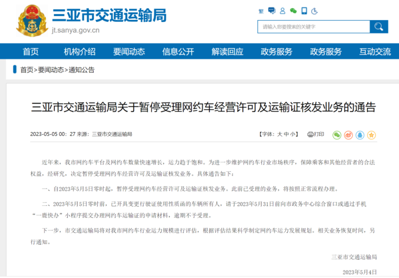 而在刚刚过去的5月,长沙和三亚两地更是直接发出通知,将暂停受理网约车运输证新增业务。待当地的运力评估完成之后,再适时恢复相关业务办理。
