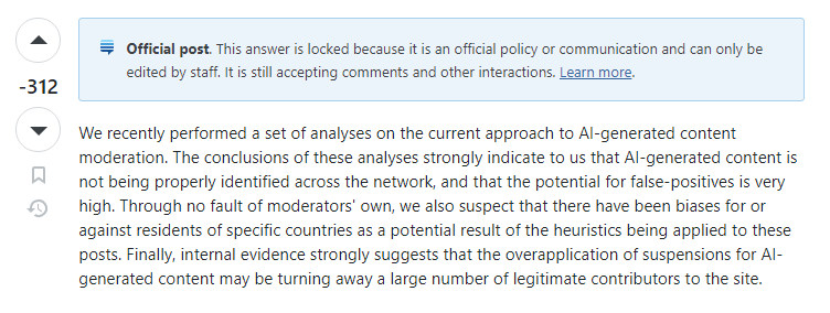 为了缓解这个问题,Stack Overflow要求版主在决定修改、删帖及禁言用户时,需使用非常严格的证据标准确定帖子是否由AI生成——版主此前惯用的基于写作风格,以及论坛行为等判断标准将不再可用。且由于GPT检测器误判率过高,官方也决定将检测器结果排除在判断指标之外。
