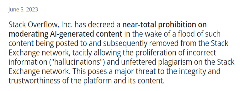 而对于目前的人工智能生成工具来说,在没有彻底解决幻觉问题前,它们所能提供的信息并不符合Stack Overflow的一贯标准,也无助与建立一个值得用户信赖的社区环境,当用户在无法验证GPT所提供的答案准确性的情况下将这些信息粘贴到代码中时,社区长期以来建立的用户信任就会被打破。